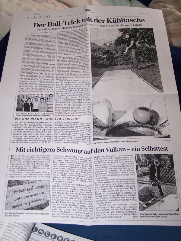 "Hannoversche Allgemeine Zeitung": Spaß für die ganze Familie"Hannoversche Allgemeine Zeitung": Der Ball-Trick mit der Kühltasche "Tippen Sie doch mal, wie viele Menschen in Deutschland in ihrer Freizeit Minigolf spielen. 500 000? Drei Millionen? Tatsächlich sind es rund 20 Millionen - wer hätte das gedacht!" Die "Hannoversche Allgemeine Zeitung" berichtete in ihrer Ausgabe vom 14.8.2007 ganzseitig über Minigolf als Leistungssport und als Familienspaß am Beispeil des 1. BGC Hannover und seiner schmucken Kombinations-Anlage in Mühlenberg.
