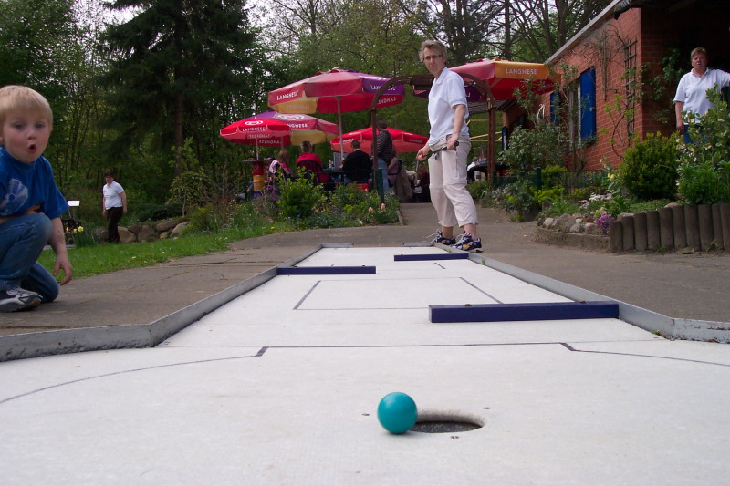Die amtierende Deutsche Meisterin Gaby Rahmlow (SV Lurup) fügte ihrer umfangreichen Medaillensammlung den erneuten Titel einer "Hamburger Meisterin" hinzu. Bei den Herren dominierte der Niendorfer Sven Basse Lohbrügge. Im Rahmen der Hamburger Ranglistenspieltage wurden gestern die "Hamburger Meister 2008" ermittelt. Nach den Spieltagen in Niendorf, Lurup und Lohbrügge (ein Streichergebnis) setzten sich bei den Damen Gaby Rahmlow und bei den Herren Sven Basse durch. Basse dominierte den Spieltag in Lohbrügge mit erstklassigen 81 Schlägen. Beste Dame gestern war Heike Listander-Teupe mit 85 Schlägen. Klein-Erik staunt nicht schlecht: Mama Heike Listander-Teupe fängt gleich mal mit einem "Ass" an ..... Die weiteren Hamburger Meister: Seniorinnen (+45 Jahre): Brunhilde Rahmlow (SV Lurup), Senioren (+45 Jahre): Karsten Parbst (VfL Lohbrügge), Senioren (+58 Jahre): Rolf Rahmlow (SV Lurup), Schüler: Roger Müller (VfL Lohbrügge), Juniorinnen (15-19 Jahre): Anna Jeske (SV Lurup), Junioren (15-19 Jahre): Merlin Wilcken (SV Lurup) 28.04.2008 |