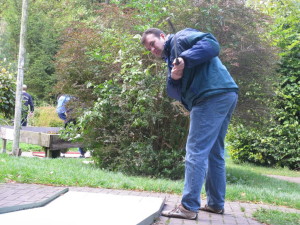 | .... und dann rein ins Vergnügen. Der als Einzelspieler angetretene Kieler begann schwach (28), spielte dann in dieser Runde tief grün (21). Nach zwei folgenden 25er-Runden hatte er 99 Schläge auf der Ergebniskarte. |